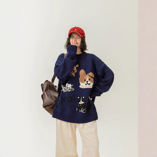 Retro Puppy Printed Pullover Crew Neck Sweater