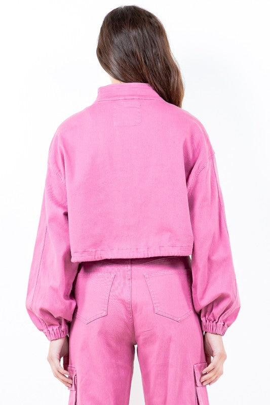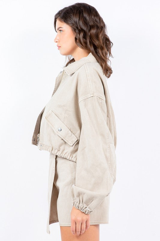 American Bazi Full Size Drawstring Hem Cargo Pocket Cropped Worker Jacket Plus Size
