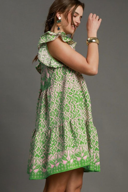 She + Sky Full Size Printed Notched Short Sleeve Frill Tiered Dress Plus Size